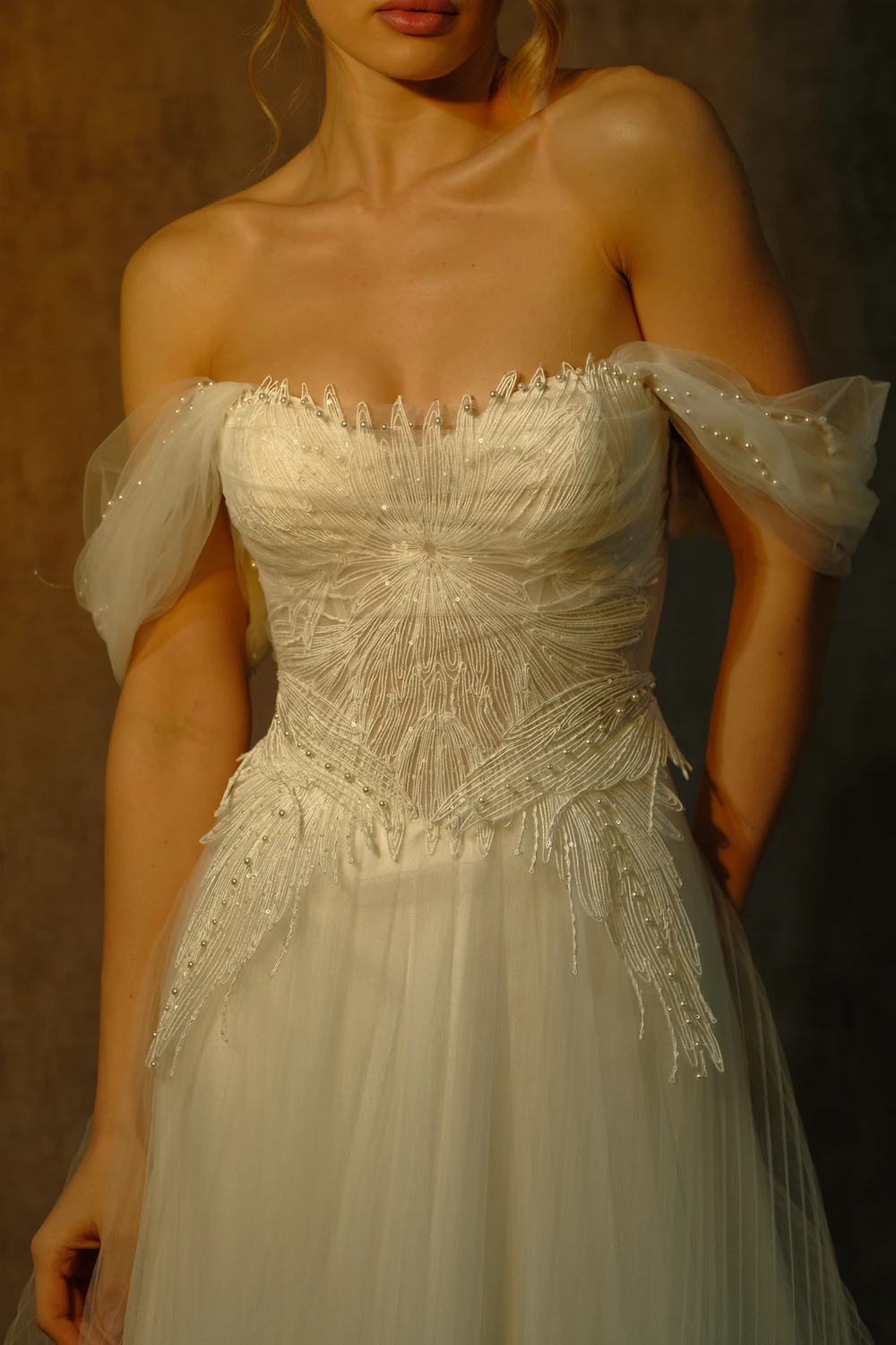 Piliseli eteği basque bel detayı ve danteli ile retro bir gelinlik havası yaratan Cassia gelinlik düşük tül kolları ile modern bir görüntü de sağlıyor.